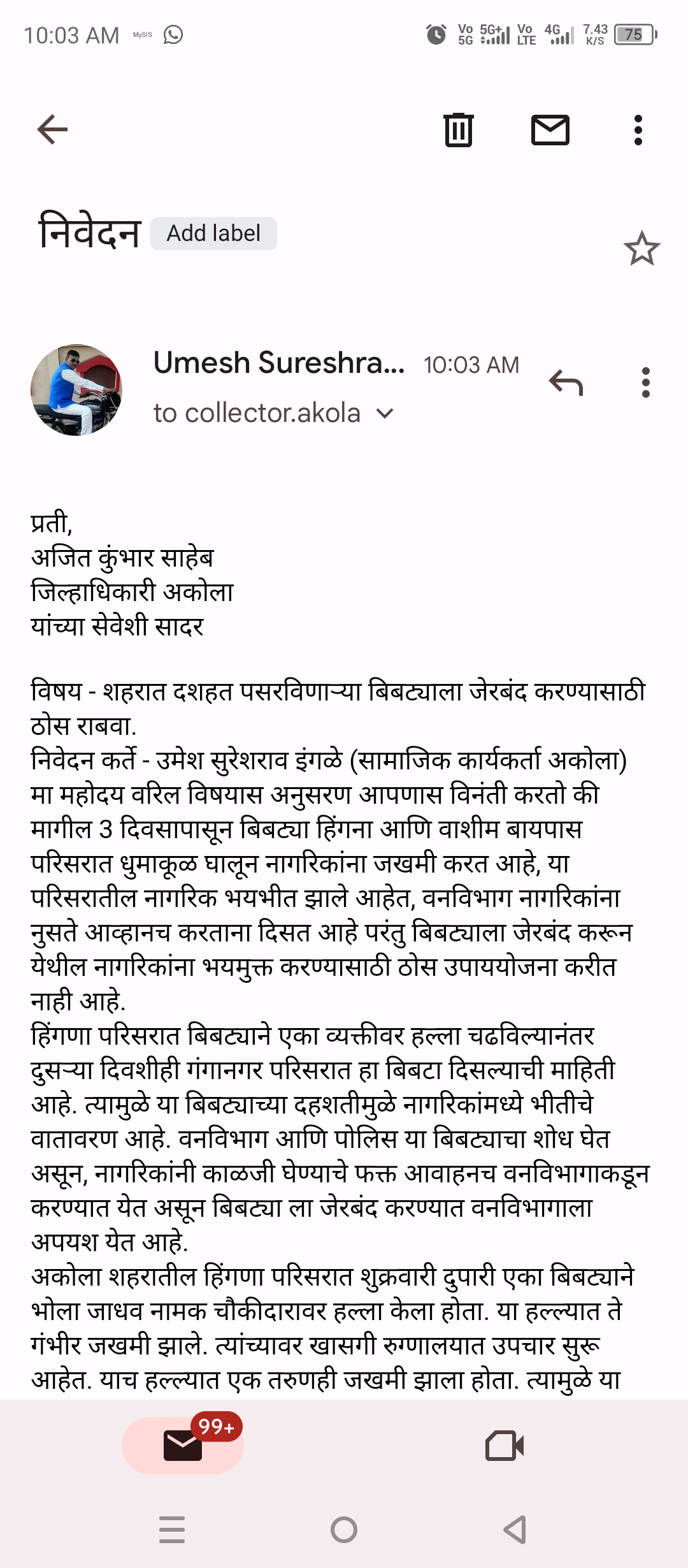 शहरात दशहत पसरविणाऱ्या बिबट्याला जेरबंद करण्यासाठी ठोस उपाययोजना राबवा – उमेश इंगळे