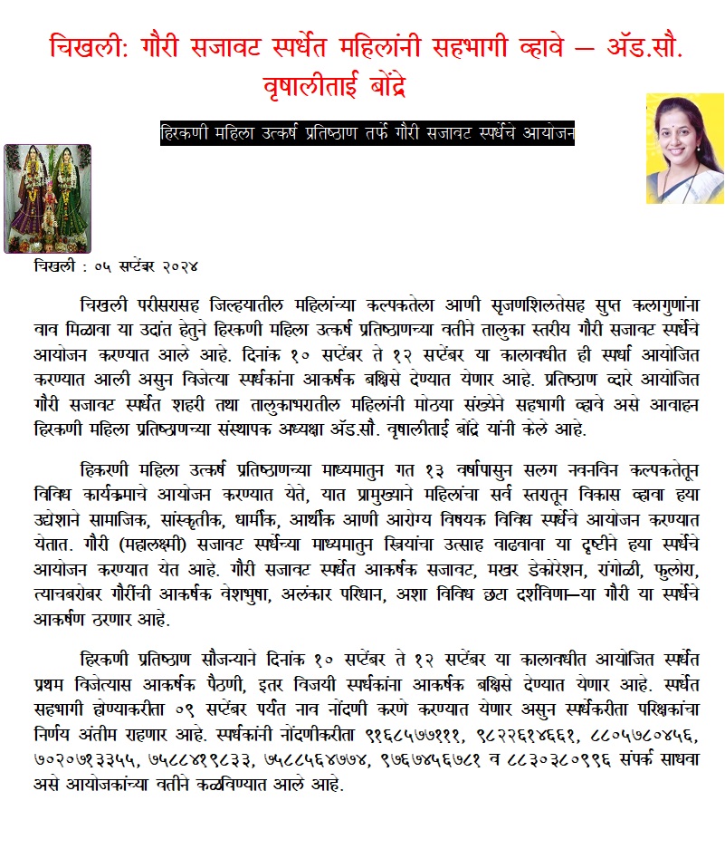 चिखलीः गौरी सजावट स्पर्धेत महिलांनी सहभागी व्हावे - अॅड.सौ.वृषालीताई बोंद्रे हिरकणी महिला…