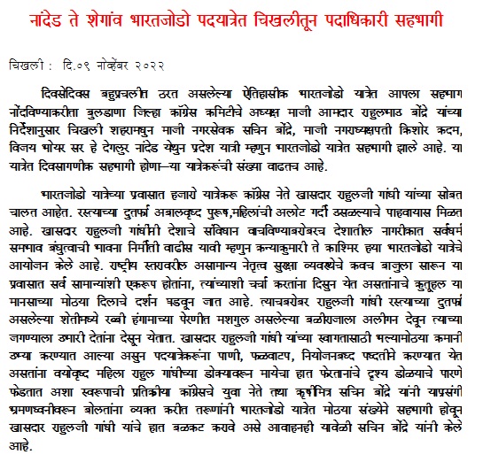 चिखली: दि.09 नोव्हेंबर 2022 दिवसेदिवस बहुप्रचलीत ठरत असलेल्या ऐतिहासीक भारतजोडो यात्रेत आपला…