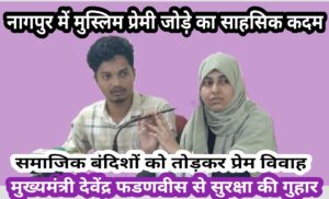 नागपुर में मुस्लिम प्रेमी जोड़े का साहसिक कदम समाजिक बंदिशों को तोड़कर प्रेम विवाह, मुख्यमंत्री देवेंद्र फडणवीस से सुरक्षा की गुहार नागपुर, 16 जुलाई 2025 – समाज की परंपरागत रुढ़ियों और धार्मिक दीवारों को तोड़ते हुए कर्नाटक और महाराष्ट्र से ताल्लुक रखने वाले एक मुस्लिम प्रेमी युगल ने नागपुर में मुस्लिम रीति-रिवाजों के अनुसार विवाह … Continue reading नागपुर में मुस्लिम प्रेमी जोड़े का साहसिक कदम : समाजिक बंदिशों को तोड़कर प्रेम विवाह, मुख्यमंत्री देवेंद्र फडणवीस से सुरक्षा की गुहार