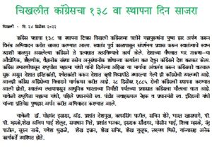 काॅगे्रस पक्षाचा 138 वा स्थापना दिवस चिखली काॅगे्रसच्या वतीने महापुरूषांना पुष्पा हार अर्पण करून विनंम्र अभिवादन करीत साजरा करण्यात आला. स्वातंत्र पुर्व काळापासुन संघर्षमय प्रवास करून स्वातंत्र्याचे स्वप्न उराषी बाळगुन असलेल्या काॅगे्रसने ते प्रत्यक्षात उतरविण्याचे कार्य केले. देषाच्या वैभवात भर टाकणा-या औद्योगिक, शैक्षणीक, वैज्ञानीक संस्था तसेच अनुसंधानीक शोधाच्या कार्याला बळ देवुन काॅंगे्रसने देष बळकट केला. काॅंगे्रस उभारणीपासून राष्ट्रपीता महात्मा गांधी यांनी दिलेल्या अंहिसा या मार्गाचा अंवलंब करून काॅंगे्रसची वाटचाल सुरू असुन देषात हरितक्रांती, श्वेतक्रांती करून देषात कृषी विद्यापीठे उभारल्या गेली ही काॅंग्रसेची उपलब्धी आहे. आजही काॅंगे्रस अंहिसेच्या विचाराने मार्गक्रमन करीत आहे. 28 डिसेंबर 1885 रोजी काॅगे्रसची स्थापना करण्यात आली होती, स्वातंत्र्य लढयापासुन आधुनिक भारताच्या निर्मीती पर्यंतच्या प्रवासात काॅगे्रसचा मौलाचा वाटा आहे. यावेळी राष्ट्रपिता महात्मा गांधी, पहिले प्रधानमंत्री स्व. पंडीत जवाहरलाल नेहरू व प्रधानमंत्री स्व. इंदिराजी गांधी यांच्या प्रतिमेस पुष्पहार अर्पन करीत अभिवादन करण्यात आले.