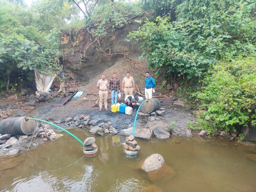 सोयगाव तालुक्यातील फर्दापूर परिसरात हातभट्टीची गावठी दारू मोठ्या प्रमाणावर बनवून गाळून विक्री होत असल्याची गुप्त माहिती सहायक पोलिस निरीक्षक प्रफुल्ल साबळे यांना दि.२१/१०/२४ रोजी माहिती पोलीसांना मिळताच परिसरातील वाघूर नदीच्या पात्रात गावठी दारूच्या हातभट्टीवर धाड टाकली असता. गावठी दारु तयार करणेसाठी-६००० हजाराचे-६० लिटर्स कच्चे रसायन जप्त करून नष्ट करण्यात आले. परिसरात फर्दापूर गांवाजवळील वाघूर नदीच्या पात्रात हातभट्टीची गावठी दारु मोठ्या प्रमाणात टाक्याने फर्दापूर येथील इसम तयार करीत असल्याची माहिती येथील पोलिसांना मिळताच फर्दापूर पोलीस स्टेशनचे सहा. पोलीस निरिक्षक प्रफुल्ल साबळे यांनी स्वतः पोहेकॉ पद्माकर कोळी व्यवसाय नोकरी फर्दापूर यांचे पथक तयार करून गांवाजवळील वाघूर नदीच्या पात्रात धाड टाकली असता त्या ठिकाणी गावठी दारु तयार करणेसाठी लागणारे कच्चे रसायनआरोपी गुलशन समशेर तडवी वय ४१ हा कच्चे रसायन ढवळतांना मिळून आला. धाडीत १५० लिटर्सच्या चार टाक्या-६०० लिटर्स कच्चे रसायन मिळून आले. ६०० लिटर्स कच्चे रसायन-६००० हजार रुपये किंमतीचे होते. फर्दापूर पोलिसांनी जागेवर कच्चे रसायन नष्ट करण्यात आले. पोकॉ पद्माकर कोळी यांनी दिलेल्या फिर्यादीवरुन आरोपी गुलशन समशेर तडवी यांच्याविरुद्ध फर्दापूर पोलीस स्टेशन पोव्ही- गुरनं. १३२/२०२४ नुसार मुंबई दारुबंदी अधिनियम-६५ (फ) प्रमाणे गुन्हा दाखल करण्यात आलेला आहे. याबाबतचा पुढील तपास सपोनि प्रफुल्ल साबळे यांच्या मार्गदर्शनाखाली पोनाईक हे करीत आहेत. यापुढे ही गावठी दारुची कारवाई सुरुच राहील असेहि उपनिरीक्षक सुग्रीव चाटे यांनी बोलताना सांगितले आहे