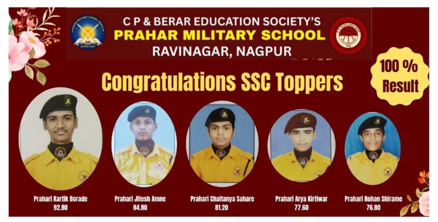 नागपूर : महाराष्ट्र राज्य माध्यमिक व उच्च माध्यमिक शिक्षण मंडळाच्या इ. 10 वी च्या निकालात प्रहार मिलिटरी स्कूल, रवी नगर, नागपूर येथील विद्यार्थ्यांनी घवघवीत यश मिळवले असून यंदाही शाळेने 100% निकालाची उज्वल परंपरा कायम राखली आहे. गुणवत्ताधारित यादीत स्थान पटकावून विद्यार्थ्यांनी शाळेच्या नावलौकिकात लक्षणीय भर घातली आहे.