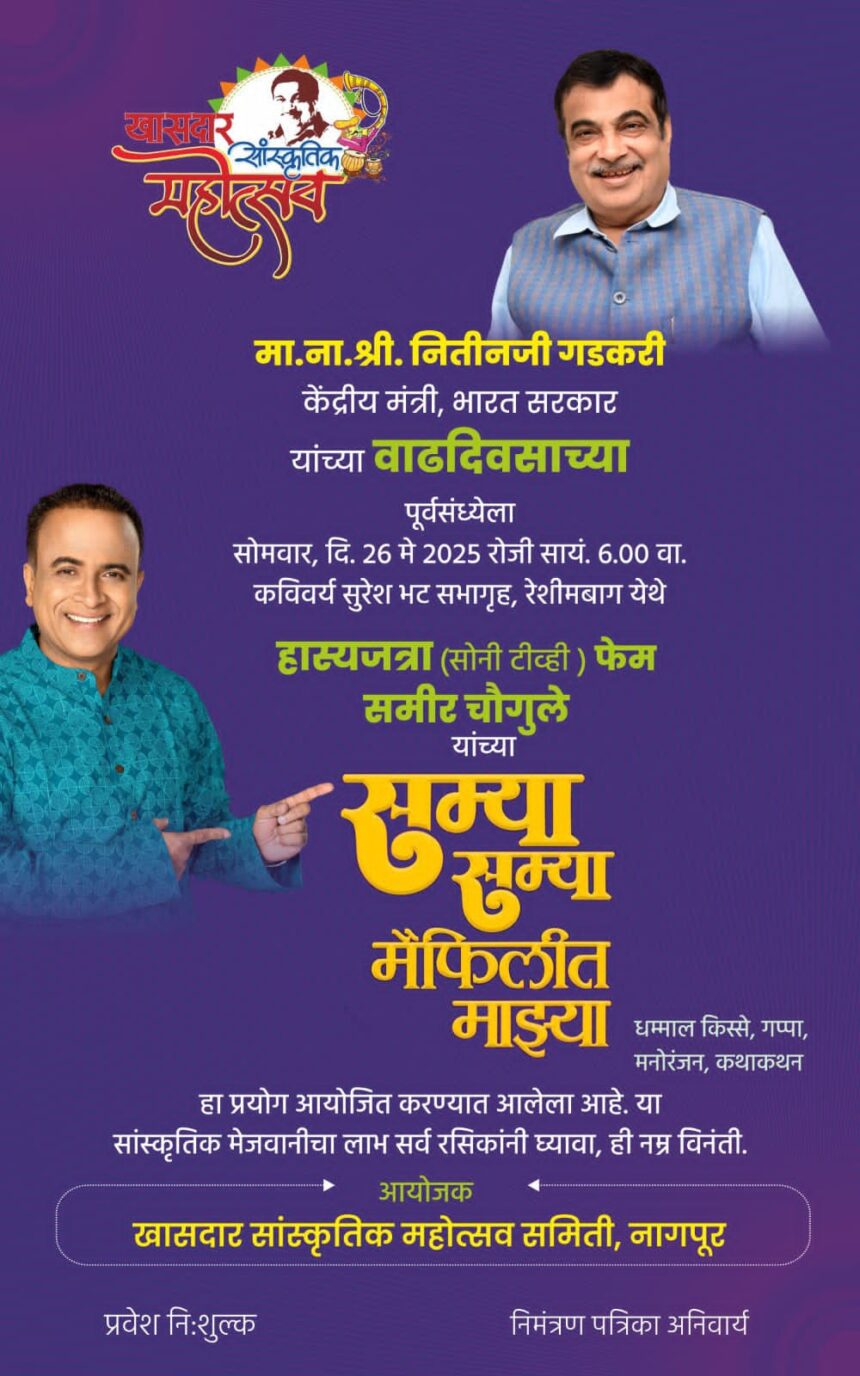 नागपुर, 26 मई 2025 – केंद्रीय मंत्री नितिन गडकरी के जन्मदिन के उपलक्ष्य में “खासदार सांस्कृतिक महोत्सव समिति, नागपुर” द्वारा एक विशेष सांस्कृतिक कार्यक्रम का आयोजन किया गया है। यह कार्यक्रम सोमवार, 26 मई को सुबह 6 बजे कविवर्य सुरेश भट सभागृह, रेशीमबाग में आयोजित किया जाएगा।