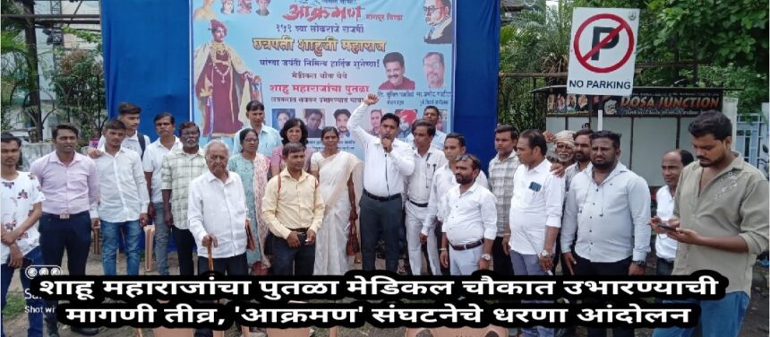 शाहू महाराजांचा पुतळा मेडिकल चौकात उभारण्याची मागणी तीव्र, ‘आक्रमण’ संघटनेचे धरणा आंदोलन