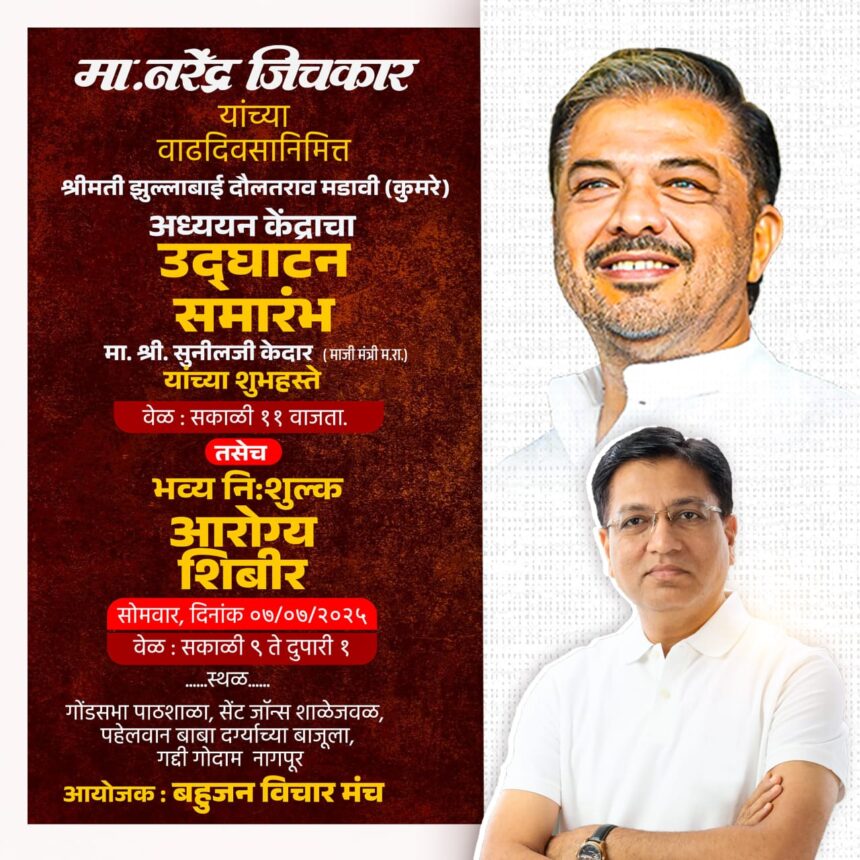 समाजात शिक्षणाचे बीज रुजवण्यासाठी आणि वंचित घटकांना ज्ञानाच्या प्रवाहात आणण्यासाठी ‘बहुजन विचार मंच’ने आणखी एक महत्त्वाचे पाऊल उचलले आहे. या मंचाचे संयोजक श्री. नरेंद्र जिचकार यांच्या वाढदिवसानिमित्त, स्व. झुल्लाबाई मडावी (कुमरे) अध्ययन केंद्र आणि ‘पढ़े हम, पढ़ाएँ हम’ शिक्षण केंद्र या दोन प्रेरणादायी उपक्रमांचे उद्घाटन सोहळा आयोजीत करण्यात आला आहे.