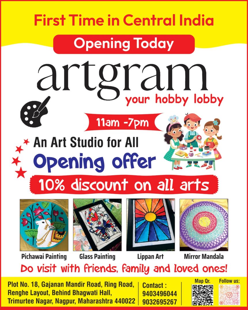 नागपुरवासियों के लिए खुशखबरी! मध्य भारत में पहली बार कला प्रेमियों के लिए तैयार किया गया अनोखा आर्ट स्टूडियो “आर्टग्राम – योर हॉबी लॉबी” आज से आपके लिए खुल गया है। यह स्टूडियो प्रतिदिन सुबह 11 बजे से शाम 7 बजे तक सभी आयु वर्ग के लोगों के लिए खुला रहेगा।