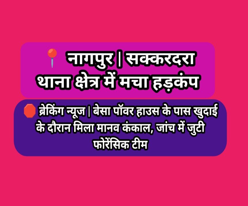 नागपुर के बेसा पॉवर हाउस के पास सड़क निर्माण के लिए चल रही खुदाई के दौरान मानव कंकाल मिलने से इलाके में सनसनी फैल गई है। मजदूरों द्वारा कंकाल दिखाई देने की जानकारी मिलते ही फोरेंसिक टीम और वरिष्ठ पुलिस अधिकारी मौके पर पहुंच गए हैं और जांच शुरू कर दी गई है।