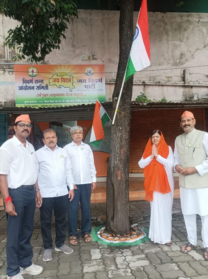 भारतीय स्वाधीनता के 79वें स्वतंत्रता दिवस के मौके पर विदर्भ राज्य आंदोलन समिती और जय विदर्भ पार्टी के पश्चिम विदर्भ विभागीय कार्यालय में