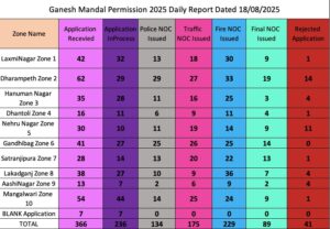 गणेशोत्सव 2025 के लिए नागपुर शहर में मंडलों द्वारा की गई परमिशन प्रक्रिया की रिपोर्ट प्रशासन ने जारी कर दी है। इस बार कुल 366 आवेदन प्राप्त हुए, जिनमें से 89 मंडलों को अंतिम अनुमति (Final NOC) प्रदान की गई है। वहीं, नियमों का पालन न करने वाले 41 आवेदन निरस्त कर दिए गए हैं। शेष 236 आवेदन फिलहाल प्रक्रिया में हैं।