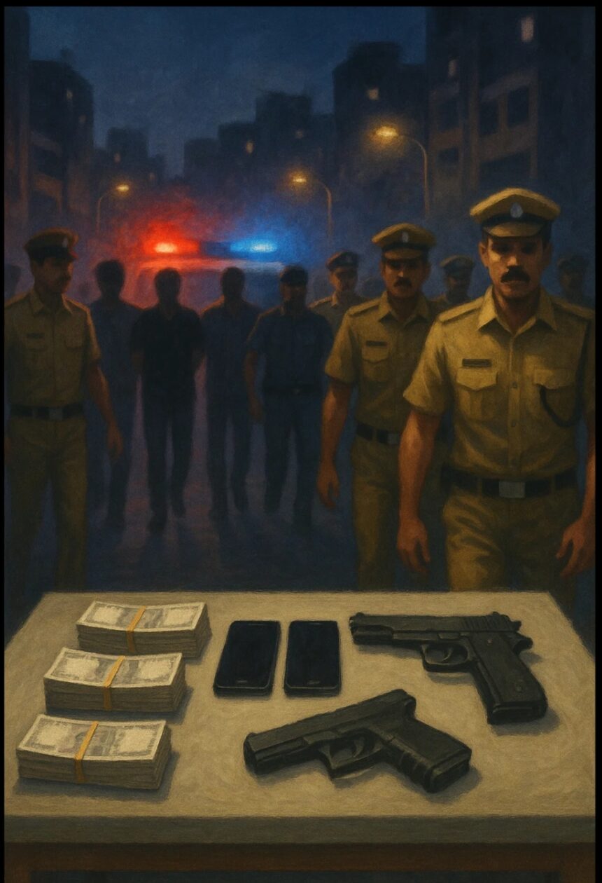 गिरफ्तार आरोपियों में सिमरजीतसिंह संधु (40, पंजाब), शेख हुसैन उर्फ जावेद शेख (37, नागपुर), अब्दुल नावेद (33, नागपुर) और सैयद जिशान (32, नागपुर) शामिल हैं। इनके पास से दो कार, तीन दुपहिया वाहन, देसी मौजर, जिंदा कारतूस, पांच मोबाइल फोन और नकद राशि सहित कुल 21 लाख 11 हजार रुपये का माल जब्त किया गया है।