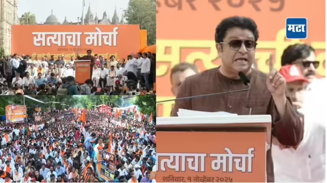 राज ठाकरेंनी यावेळी मतदारयाद्यांतील घोळाचे पुरावे असलेली कागदपत्रांची मोठी गठ्ठी सभेत दाखवत, “आमच्याकडे ठोस पुरावे आहेत. हजारो मतदारांनी दुबार मतदान केल्याचे आमच्या यादीत स्पष्ट दिसते,” असा दावा केला.