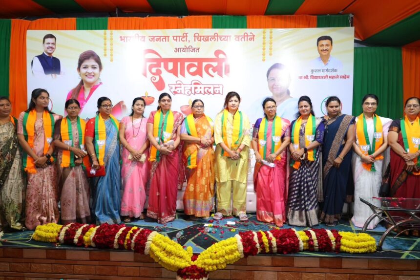 भाजप आणि श्री अंबिका अर्बन मल्टिस्टेट को-ऑप. सोसायटी लिमिटेड यांच्या संयुक्त विद्यमाने आयोजित दीपावली स्नेहमिलन कार्यक्रम शनिवारी मौनी बाबा संस्थानच्या भव्य प्रांगणात अत्यंत उत्साहात पार पडला. हा कार्यक्रम केवळ स्नेहभेटीपुरता मर्यादित न राहता, आगामी चिखली नगर परिषद सार्वत्रिक निवडणूक २०२५ च्या पार्श्वभूमीवर भाजप-महायुतीच्या संघटित तयारीचा संकल्प सोहळा ठरला.