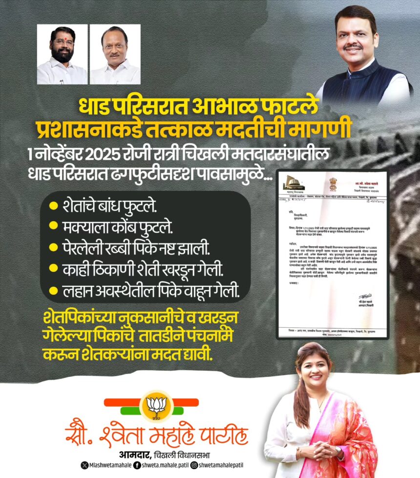 चिखली मतदारसंघातील धाड परिसरात १ नोव्हेंबर २०२५ रोजी रात्री झालेल्या ढगफुटी सदृश पावसामुळे शेतकरी बांधवांचे मोठ्या प्रमाणावर नुकसान झाले आहे. या अनपेक्षित पावसामुळे पिकांचे नुकसान, बांध तुटणे, शेतीतील माती वाहून जाणे तसेच जनावरांच्या चाऱ्याची हानी अशा विविध स्वरूपाचे आर्थिक संकट शेतकऱ्यांवर ओढवले आहे.