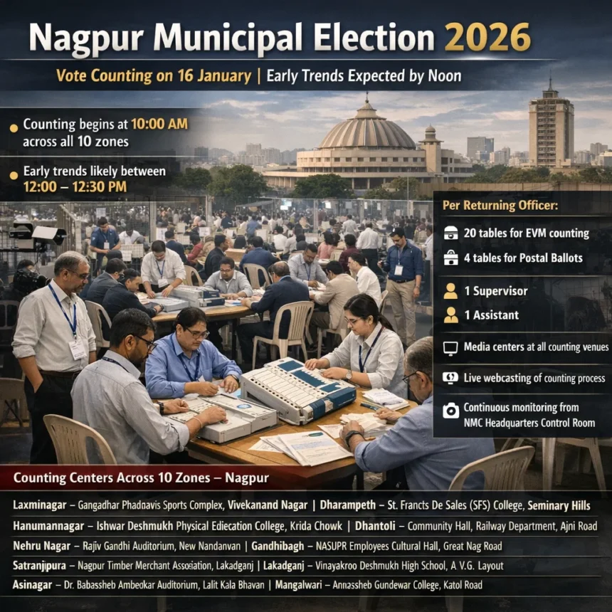 рдирд╛рдЧрдкреБрд░ рдорд╣рд╛рдирдЧрд░рдкрд╛рд▓рд┐рдХрд╛ рдЪреБрдирд╛рд╡ 2026 рдХреА рдорддрдЧрдгрдирд╛ 16 рдЬрдирд╡рд░реА рдХреЛ рд╕реБрдмрд╣ 10 рдмрдЬреЗ рд╕реЗ рд╢реБрд░реВ рд╣реЛрдЧреАред рд░рд╛рдЬреНрдп рдЪреБрдирд╛рд╡ рдЖрдпреЛрдЧ рдХреЗ рджрд┐рд╢рд╛-рдирд┐рд░реНрджреЗрд╢реЛрдВ рдХреЗ рдЕрдиреБрд╕рд╛рд░ рдпрд╣ рдкреНрд░рдХреНрд░рд┐рдпрд╛ рдкреВрд░реА рдкрд╛рд░рджрд░реНрд╢рд┐рддрд╛, рдЕрдиреБрд╢рд╛рд╕рди рдФрд░ рд╕рдЦреНрдд рдирд┐рдЧрд░рд╛рдиреА рдореЗрдВ рд╕рдВрдкрдиреНрди рдХрд░рд╛рдИ рдЬрд╛рдПрдЧреАред рд╢рд╣рд░ рдХреЗ рджрд╕реЛрдВ рдЬреЛрди рдореЗрдВ рдПрдХ рд╕рд╛рде рдорддрдЧрдгрдирд╛ рдЖрд░рдВрдн рд╣реЛрдЧреА, рдЬрд┐рд╕рд╕реЗ рд╢реБрд░реБрдЖрддреА рд░реБрдЭрд╛рди рджреЛрдкрд╣рд░ 12 рд╕реЗ 12:30 рдмрдЬреЗ рдХреЗ рдмреАрдЪ рд╕рд╛рдордиреЗ рдЖрдиреЗ рдХреА рд╕рдВрднрд╛рд╡рдирд╛ рд╣реИред
