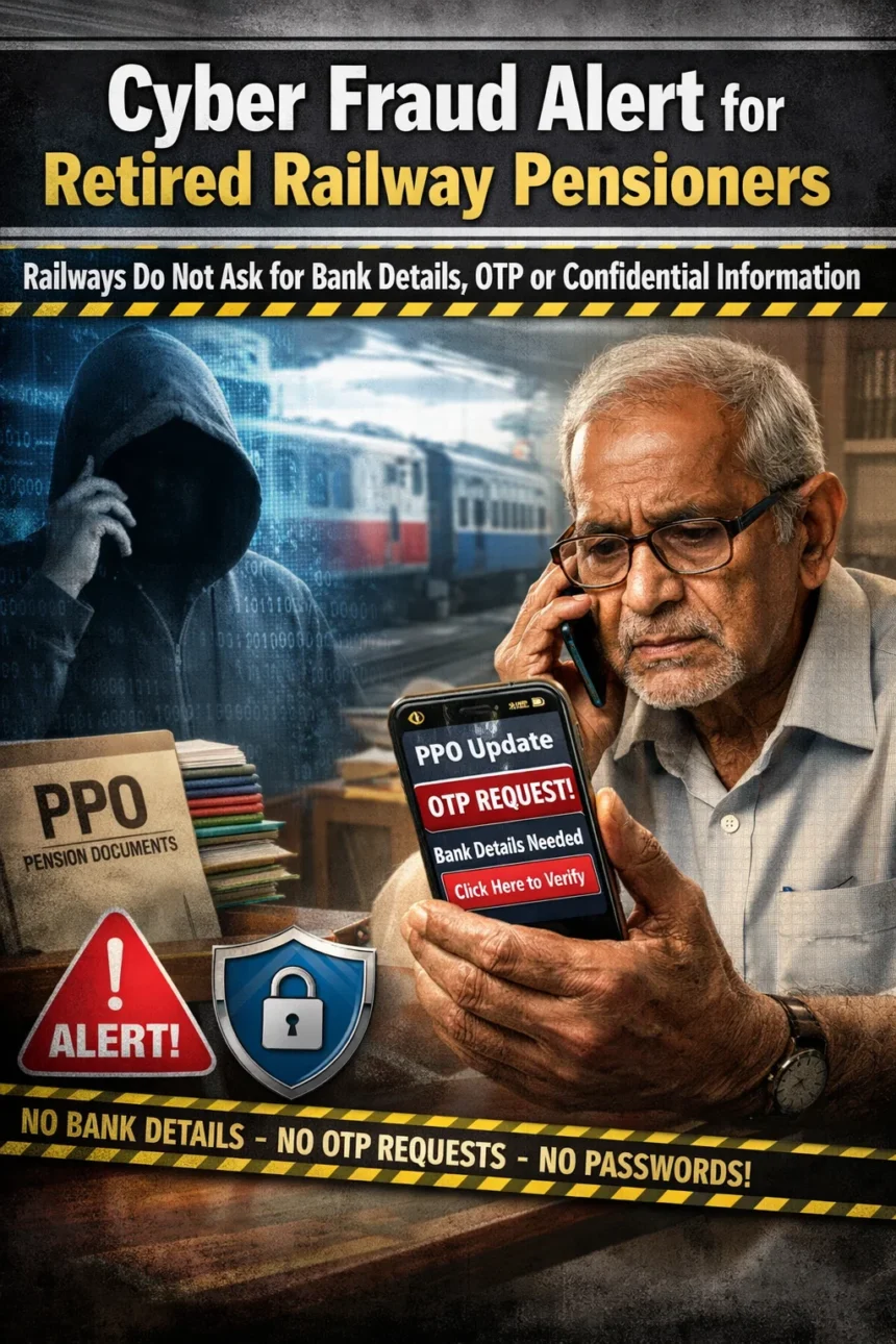 नई दिल्ली, 25 फरवरी 2026: प्रेस सूचना ब्यूरो द्वारा जारी आधिकारिक सूचना में रेलवे के सेवानिवृत्त कर्मचारियों को साइबर ठगी से सावधान रहने की अपील की गई है। हाल के दिनों में कुछ साइबर अपराधी स्वयं को रेलवे अधिकारी बताकर फर्जी फोन कॉल, एसएमएस और व्हाट्सऐप संदेश भेज रहे हैं तथा पीपीओ अपडेट, केवाईसी सत्यापन या अतिरिक्त पेंशन लाभ दिलाने के नाम पर व्यक्तिगत और बैंक संबंधी गोपनीय जानकारी मांग रहे हैं।