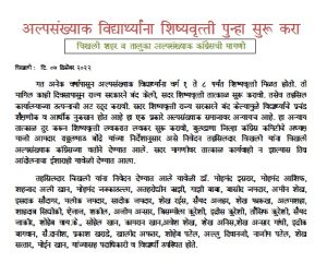 र्षापासुन अल्पसंख्याक विद्यार्थ्यांना वर्ग 1 ते 8 पर्यंत षिष्यवृत्ती मिळत होती. ती मागिल काही दिवसापासुन राज्य सरकारने बंद केली, सदर षिष्यवृत्ती तात्काळ सुरू करावी. तसेच तहसिल कार्यालयाच्या उत्पन्नाची अट रद्द करावी. सदर षिष्यवृत्ती राज्य सरकारने बंद केल्यामुळे विद्यार्थ्यांचे प्रचंड शैक्षणीक व आर्थीक नुकसान होत आहे हा एक प्रकारे अल्पसंख्याक समाजावर अन्यायच आहे. हा अन्याय तात्काळ दुर करून षिष्यवृत्ती लवकरात लवकर सुरू करावी, बुलडाणा जिल्हा कॉग्रेस कमिटीचे अध्यक्ष माजी आमदार राहुलभाउ बांेद्रे यांच्या निर्देषानुसार असे निवेदन तहसिलदार चिखली यांना चिखली अल्पसंख्याक कॉग्रेसच्या वतीने देण्यात आले. सदर मागणीवर तात्काळ कार्यवाही न झाल्यास तिव्र आंदोलनाचा ईषाराही यावेळी देण्यात आला.